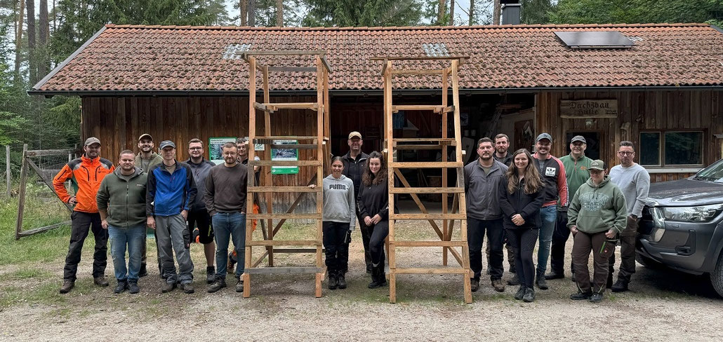 Einen Hochsitz bauen unter Berücksichtigung der Unfallverhütungsvorschriften (UVV) - stand heute auf dem Ausbildungsplan. Mit der professionellen Anleitung von Ausbilder Robert Müller (Revierförster) hat das natürlich wunderbar geklappt! Teambuilding, Aufstellen der Ansitzeinrichtung und natürlich der Test, ob es hält. Alles mit Bravur bestanden. Alle Fragen geklärt. Erneut bei kaiserlichem Wetter mit hohen Temperaturen. Genau die richtige Tätigkeit vor der kleinen Sommerpause über die Haupturlaubszeit. Ab September geht es dann voll durch, mit Beginn der theoretischen Ausbildung (10.09.), der Waffenhandhabung und auch der Brauchbarkeitsprüfung für die Jagdhunde.